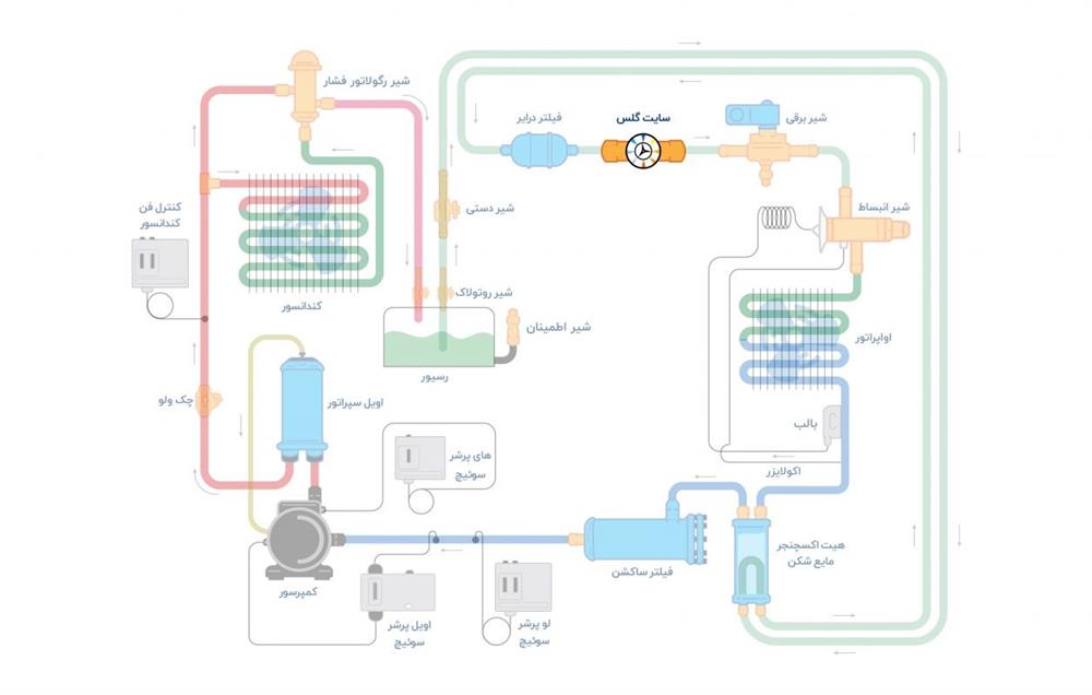 سایت گلس (Sight Glass) یا نشانگر مایع، قطعهای شفاف است که بهمنظور مشاهده و بررسی جریان سیال و یا سطح مایعات درون سیستمهای بسته مانند خطوط تبرید و تهویه مطبوع مورد استفاده میگیرد. این قطعه به کاربر اجازه میدهد تا عملکرد سیستم را مورد بررسی قرار داده و وجود مشکلاتی مانند کاهش میزان مبرد و وجود رطوبت یا ذرات آلاینده در جریان سیال را تشخیص دهد. از کاربردهای اصلی این قطعه میتوان کنترل سطح و کیفیت مبرد در سیستمهای تبرید و تهویه مطبوع، مشاهده وضعیت جریان و کیفیت مایع در سیستمهای هیدرولیکی و روغنکاری، نظارت بر جریان سیالات خورنده و یا گازها در صنایع شیمیایی و پتروشیمی و ... را نام برد.